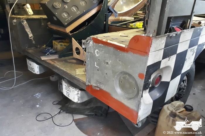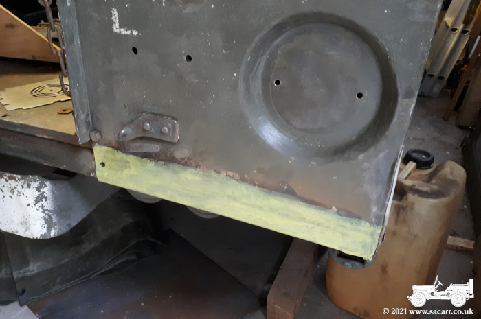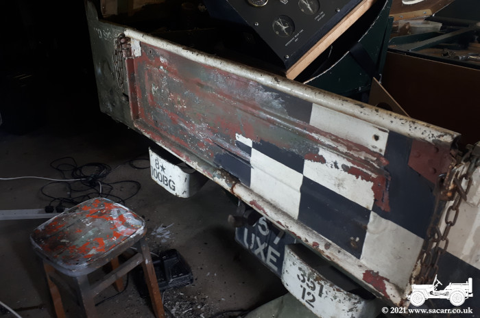 | I started the 27th by stripping the step, the rest of the cab side and the front face of the rear body. I quickly moved on down the side until there were only nine checkers left on the whole truck. Other than the windscreen, the Dodge was all olive drab or primer. As I stripped away the paint, I found an old repair on the rear corner which needed proper attention. |