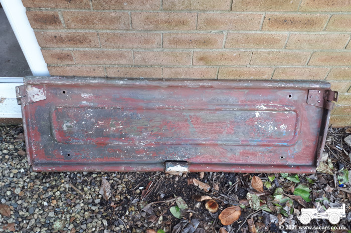 On the 21st, paint stripping continued across the back of the truck. More markings were revealed, but again, I don't believe they are original. At the right rear corner, there was a large area of rust and thin metal that needed dealing with. The tailgate was also removed to allow it and around its hinges to be cleaned up properly. |