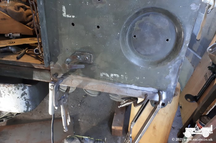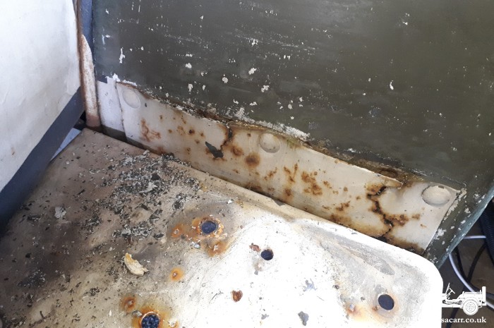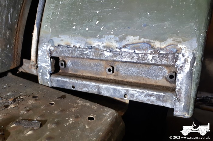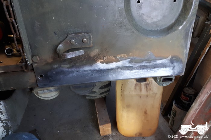 | Having prepared some replacement metal the day before, I started the 28th by welding in new sections, starting on the rear right corner. I don't like welding, mostly because I don't do it often and when I get back to it, my early welds aren't great. As I carry on through a job, the welds getter better as I re-familiarise myself. Today's welds were going pretty well and I got a fairly neat job with nice flush skins that didn't need much tidying up. It had been raining and was damp outside, so I primed that section straight away before moving on to the section behind the step. It was all slow progress, tack welding and clamping to keep the new sheeting flush. |
