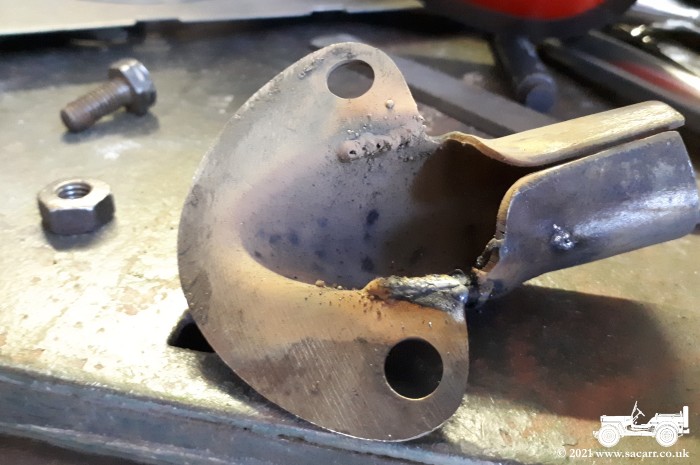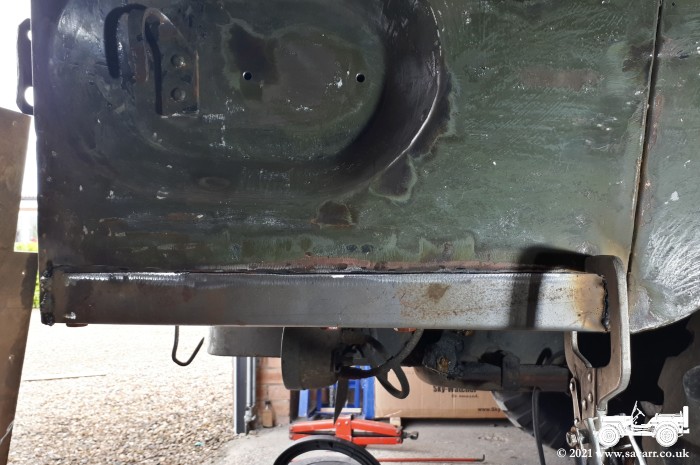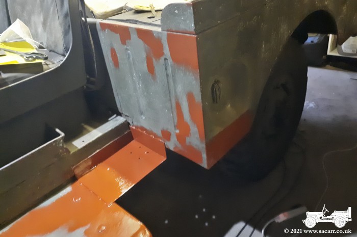 | The hat channel was cleaned up as best as I could while loose. The fender was bolted back in place to keep all the holes lined up and the hat channel was then welded to the fender to keep everything in the correct place. The fender was then removed again and the hat channel red oxide primed. Tomorrow's job is to cut and fit the new fender skin. I have a feeling I need to do the same on the other side, though it doesn't look as bad at first glance. Part way through the day, the dark olive drab paint arrived. For just twelve days work, I'm really happy with the way it's going. |