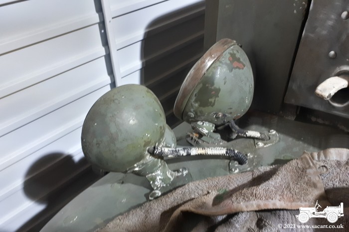 | On the 23rd, I began to strip the paint from the lights and brackets. It took most of the morning which included stripping the lights apart. Most of the rest of the day was spent sanding the paintwork on the left side. The welding repairs and some other bare metal areas were given a coat of primer to protect them. |