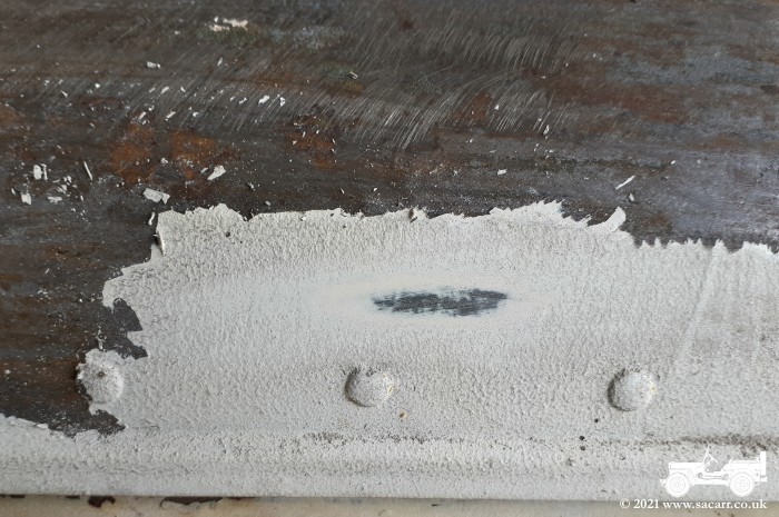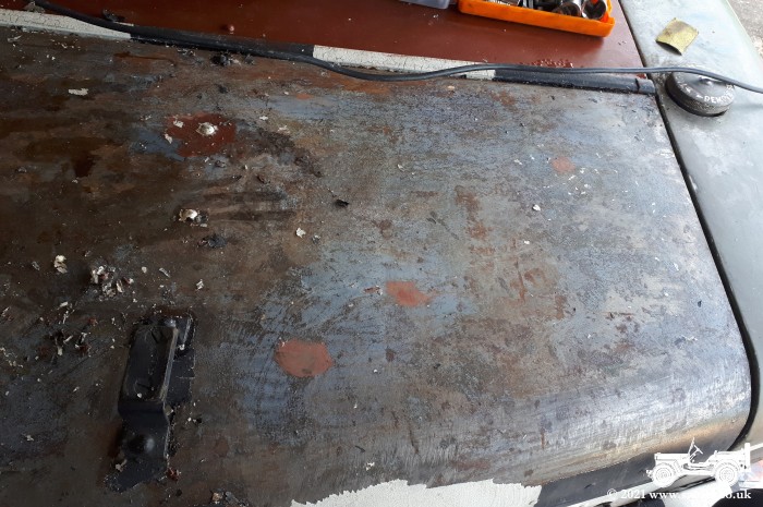 | At the bottom of the fender, the doubler had badly rusted and would need cutting off and replacing, but not today. The stripping continued along the side of the cab and under the screen seal. Time was getting on, so I switched to wiring brushing the bare metal hood and then got a coat of primer on to finish the day. |