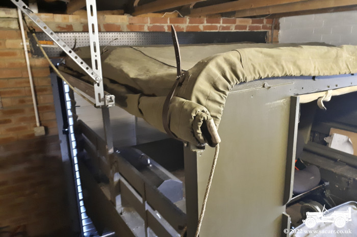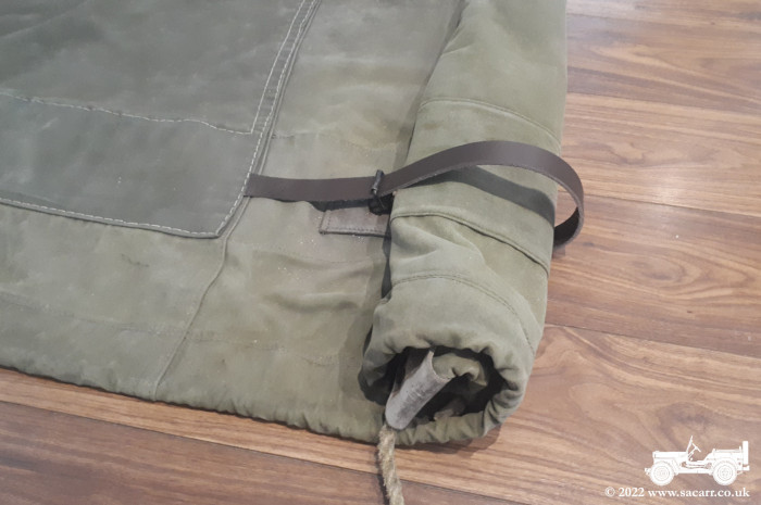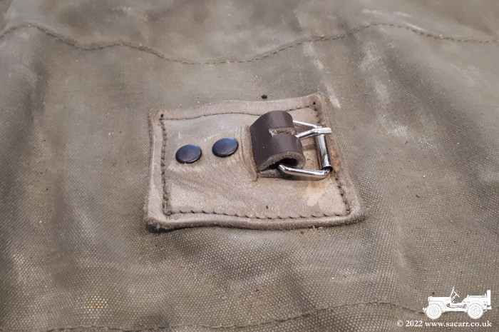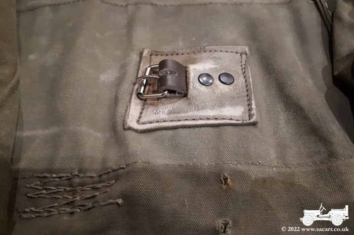 I don't know how old the Dodge canvas is, but it probably dates back at least to Norwegian Army service. There's a few small wear holes in it, but overall, it isn't too bad. One of its main problems was that three of the buckles on top were missing - the leather buckle straps having snapped long before I got it. Two of the cab canvas buckle straps had also snapped at some point and new straps sewn onto the leather patch, rather than