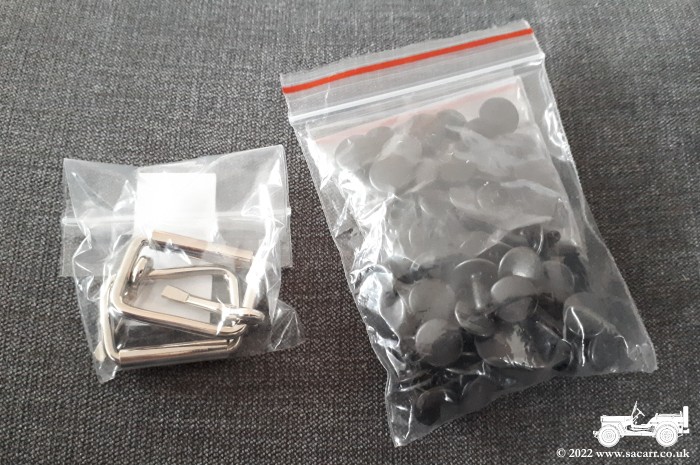 | The six canvas straps, that hold the roof canvas when the sides are rolled up, were next. They were riveted onto the D-rings firstly. These rivets can be cut off when I get around to making proper fittings. The ends of the leather were cut to a point and then I started the long job of punching out the holes for the buckles. After each punching, I had to pick out the leather waste from the tool. Unfortunately the tool has a blind hole, so the waste couldn't be poked out from the other side, but had to be picked out with a scalpel blade. However, I now have a repaired canvas and six new straps ready to be fitted. | |||||