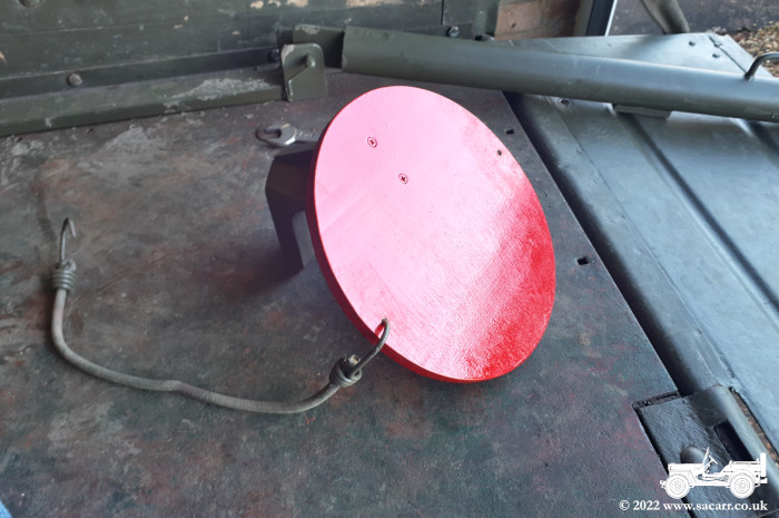 | When I took the Dodge out for the photoshoot, Lynne was following me in the Jeep. That won't always be the case, so I wanted to make the end of the crane more noticable for truck drivers coming up behind me. The crane is too high to be an issue for cars. I didn't want anything modern, so made this red disc that attaches around the end of the crane with a bungee. | |||||
