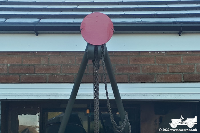 That was easy compared to wrestling with the canvas in the confined space between the door runners to the side and roof trusses over my head, trying to stop it from sliding back off the bows as I fought it into position. I got there in the end and rolled up the right side. All was well. It enabled me to get a better sense of the clearance, or lack of, between the truck roof and the position of the garage door lintel, once raised to its new position. The string in the last picture marks the lower edge of the new lintel. |