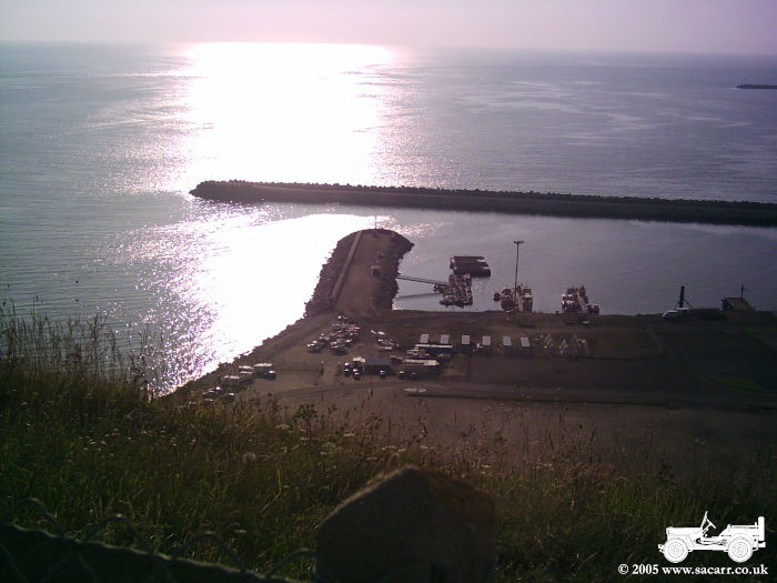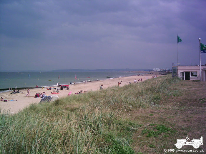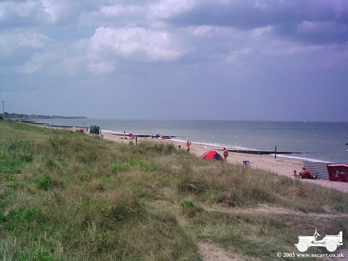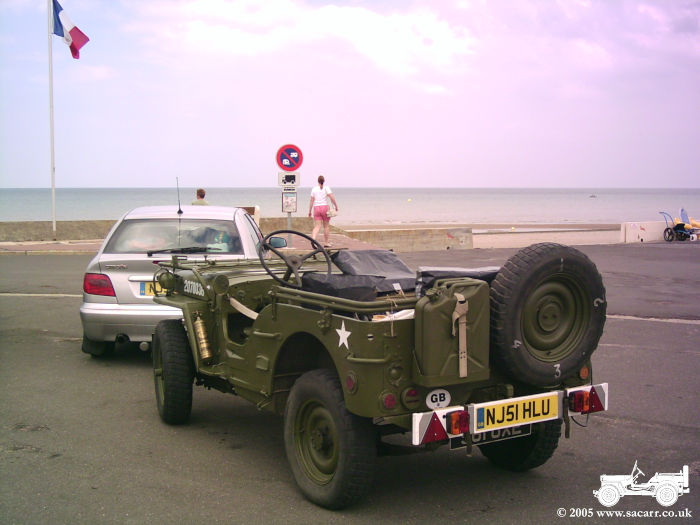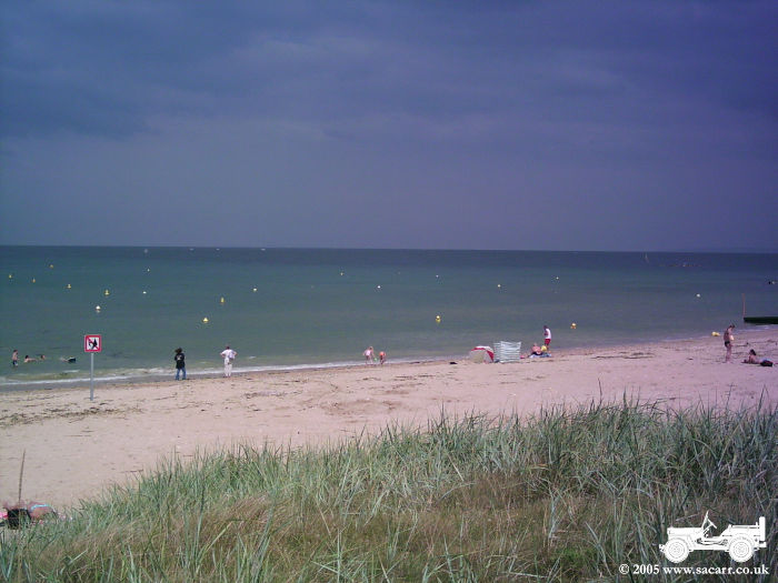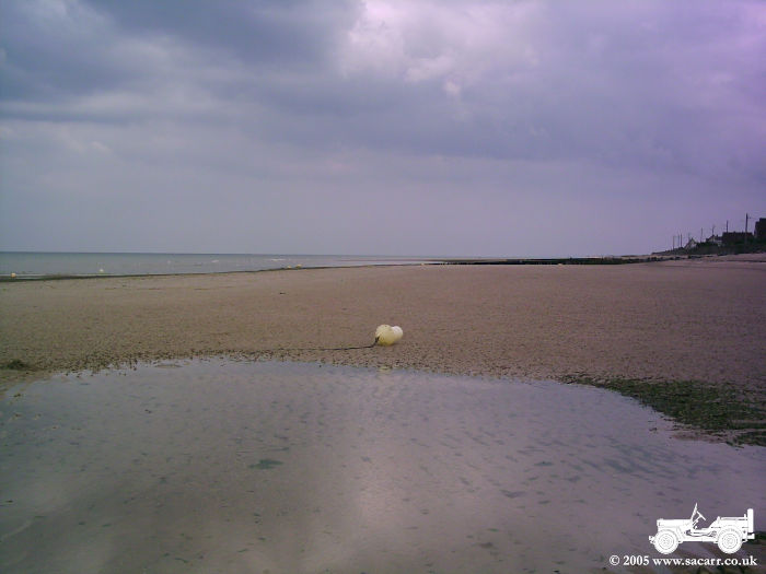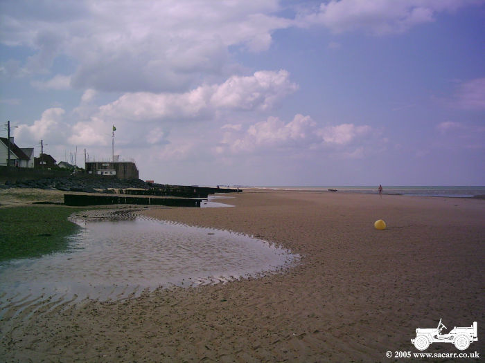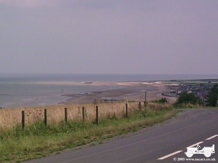 GOLD BEACH The next picture is taken along the coast from Arromanches. The second is the car and jeep, with Lynne walking off to the beach. Here we met a German military vehicle collector, also on holiday, and spent quite some time talking vehicles!!! The last picture is from the beach looking back at Arromanches. |