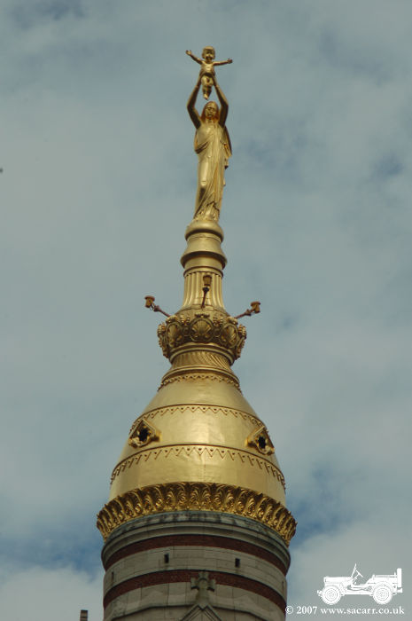 shows the statue during the war, partially toppled from the spire.