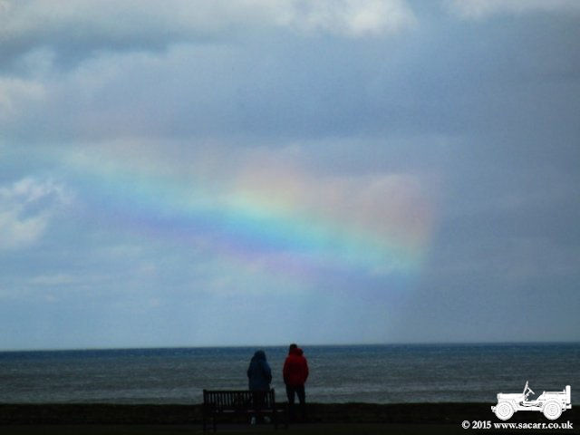 | Part way through the afternoon, an unusual rainbow formed over the sea, and rather than the usual bow shape, is was like a shimmering curtain of coloured light. I suspect it was an airliner fuel dump. As the wind got stronger, one of the large aluminium framed marquees took off, injuring a number of people. Fortunately, I was one of the few with tools, and we were able to dismantle the remains to prevent any further trouble from it. | |||