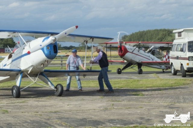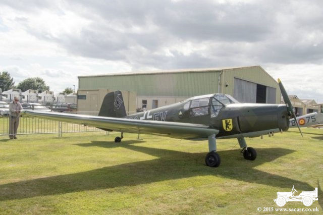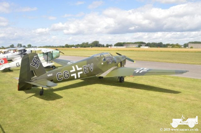 | The wind didn't ease much the following day which reduced the numbers compared to past years, but there were still eleven Bucker aircraft at the event, including one Jungmann flown over from Germany. There were a good turnout of classic cars on Saturday, but ours was the only military vehicle. | |||