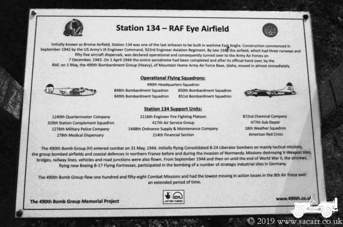 | On the 31st, our two Jeeps went out for an evening tour of some of the local airfields. The first stop was Eye airfield, Station 134. This was the home to the 490th Bomb Group. My last visit to the airfield was in 2012, but since then, a new memorial has built, being unveiled almost exactly three years before our current visit. Our first stop on our little convoy, was to this new memorial on the East side of the airfield, located very close to one of the wartime underground fuel stores. |