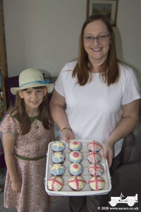 Our VE Day display preparations started in late April with the banner. The next step began the night before, with the baking of some VE Day cupcakes. The following morning, icing the designs began. I specified that they needed to be appropriate and so we settled on US Star roundels, RAF roundels, the Union flag and the flag of St George.