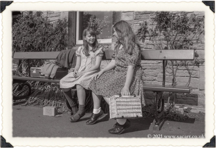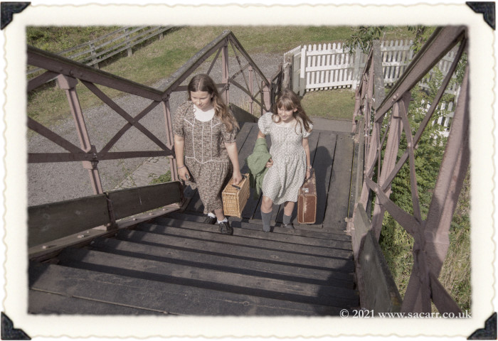 We stopped on the foot bridge over the tracks for some pictures and then moved on to the platform. With them both in their 1940's dresses, luggage and gas mask boxes, I wanted some evacuee pictures of them waiting for a train. Due to covid, there were no passenger trains running this year, so we made do with just the platform and tracks as a backdrop. After the pictures, Lynne took us on a drive and we dropped the girls off in town, catching a few other vehicles passing while there. |