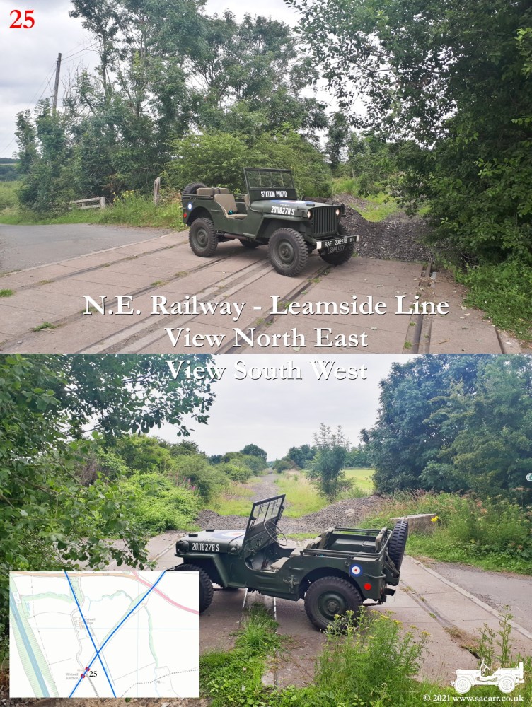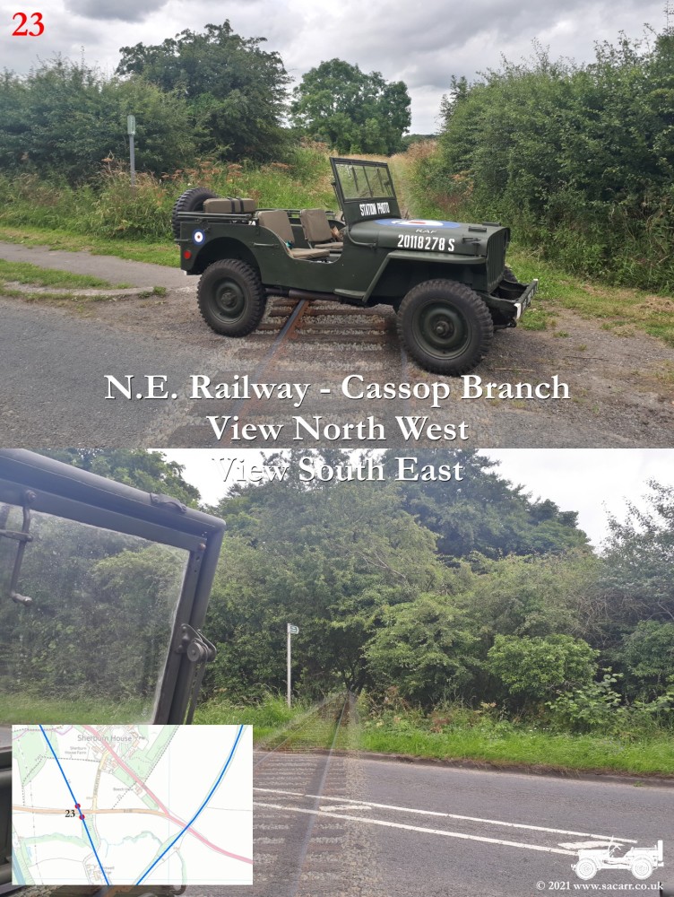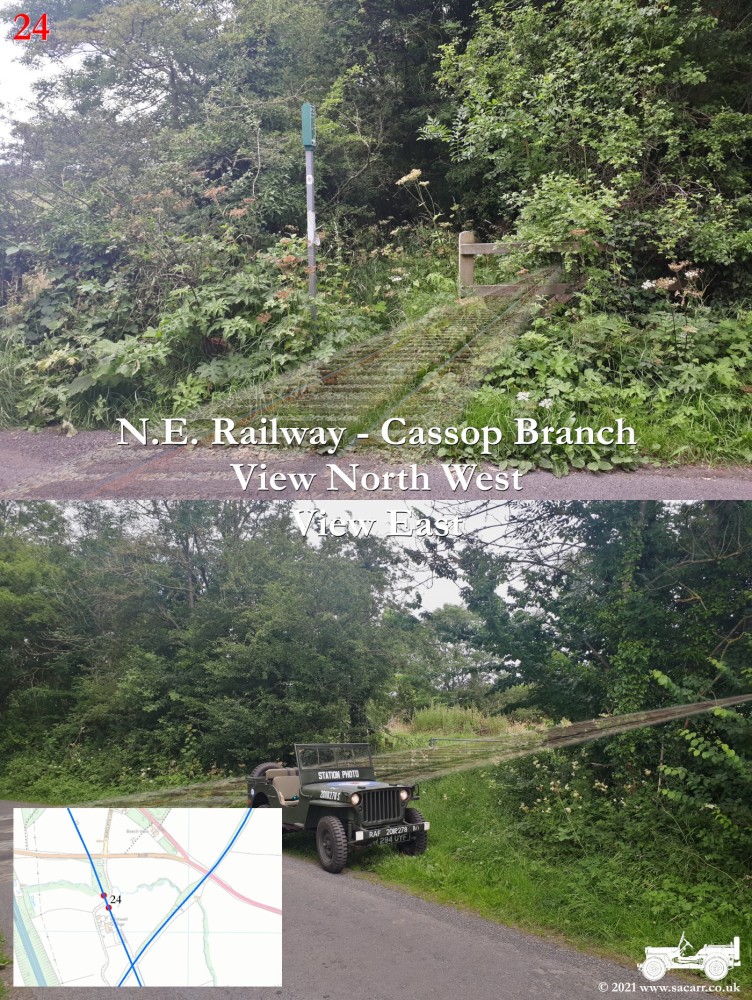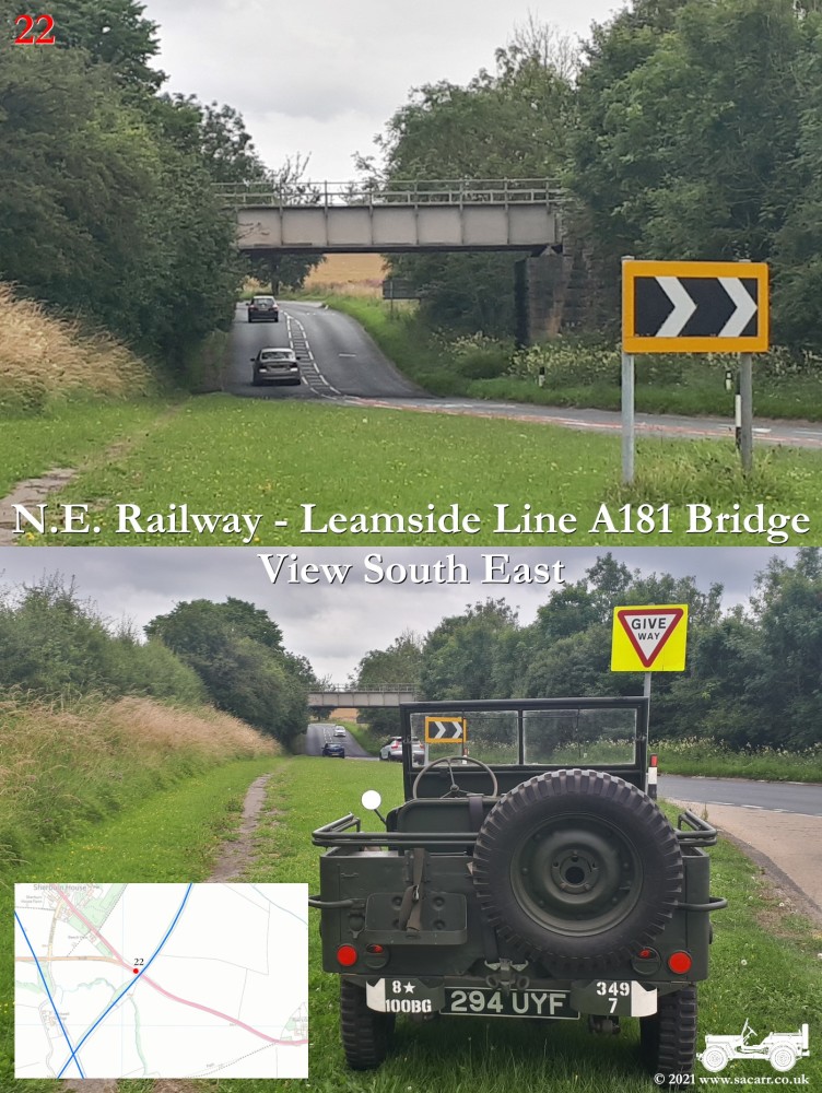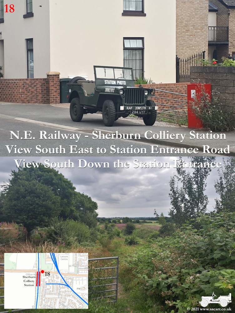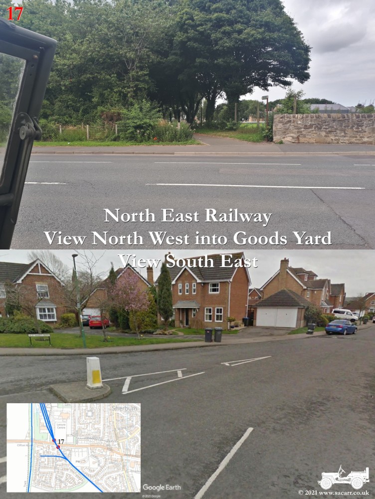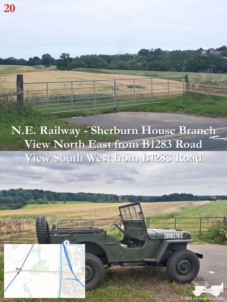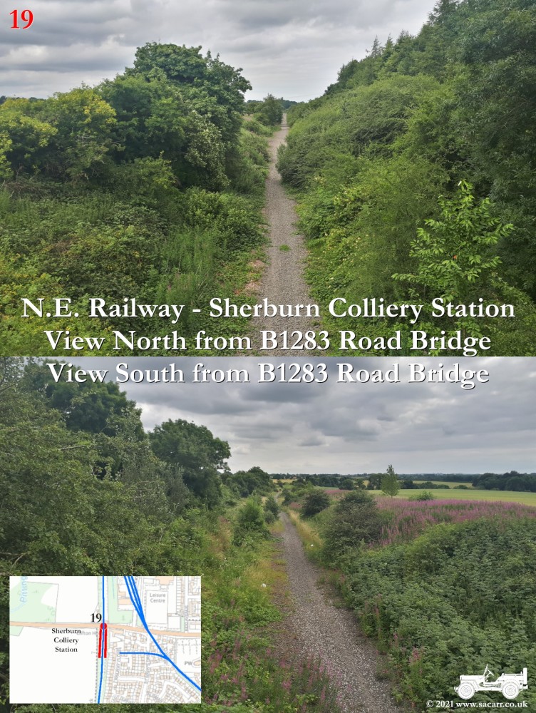 150 yards to the West is a road bridge over what was the North Eastern Railway and Sherburn Colliery Station. Where the Jeep is parked, there is a path down to the station platforms below. The station building was located at street level, where the cream building is. Photos of the station can be found here - disused-stations.org.uk - sherburn_colliery | Standing on the road bridge, looking down on the North Eastern Railway, looking each way along the line. The platforms were located to the South of the road bridge, while there was a signal box on the other side of the bridge, on the left side looking North. | Around a third of a mile further West along the road, the Sherburn House branch line cuts across the B1283 road. |