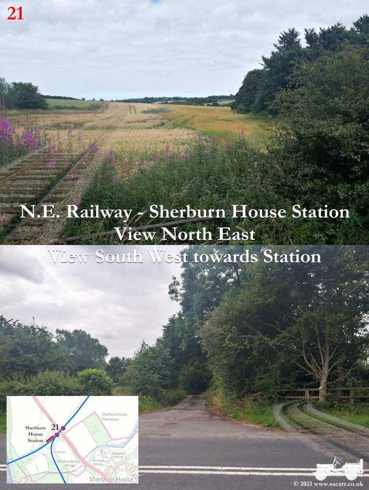 It was another three quarter mile drive, along two sides of a triangle, before I encountered the Sherburn branch again at Sherburn House Station. The station featured a curved platform below road height. The road passed over the railway via a bridge. The original station can be found here -