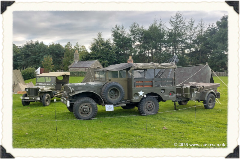 | Wednesday wasn't a proper show day and no vehicle movements were allowed, so the camp was purely a static display. The panorama below shows our camp, with five of the group vehicles on show out of the seven that were brought out for the event. Derek hadn't arrived when this picture was taken and Chris was only there for Friday and Saturday with his Dodge. Neil's Jeep is at the far left, with Paul's and Andy's Jeeps next. My two are on the right. |