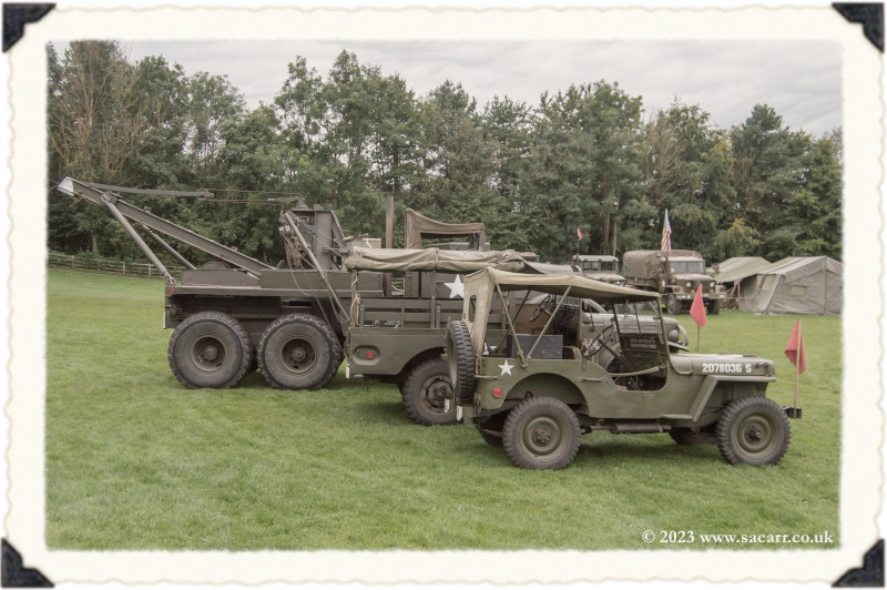 | The Corbitt wrecker was also on this convoy and when we stopped in town, I got chatting with the driver, as I'd noticed that it was marked up in 100th Bombardment Group markings, the same as all of my vehicles. It was near the end of the day, so I asked him if he could park in the middle of the field, so I could get my vehicles over for some pictures together. |
