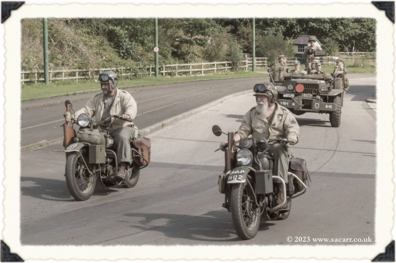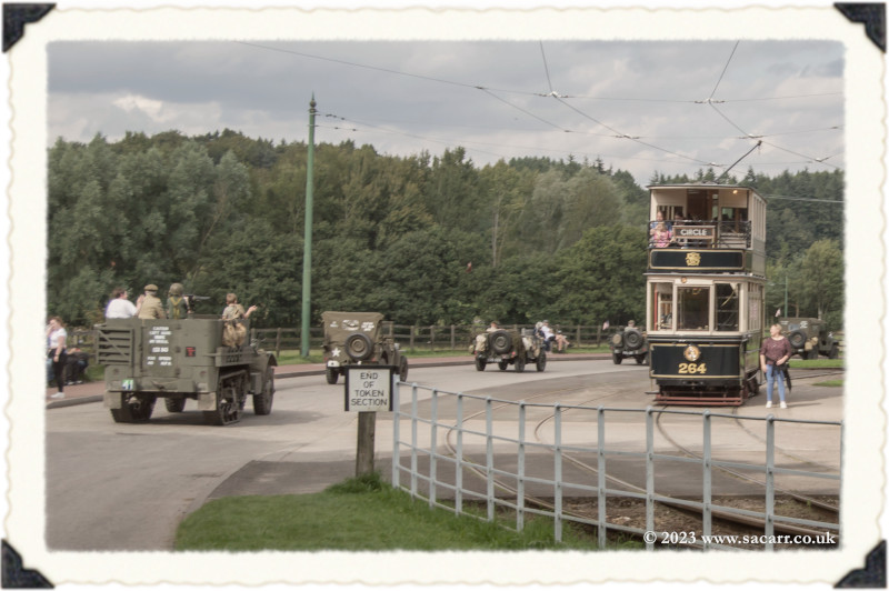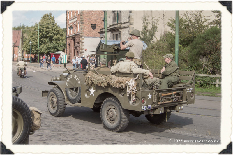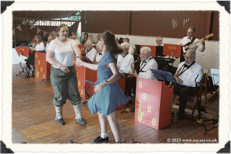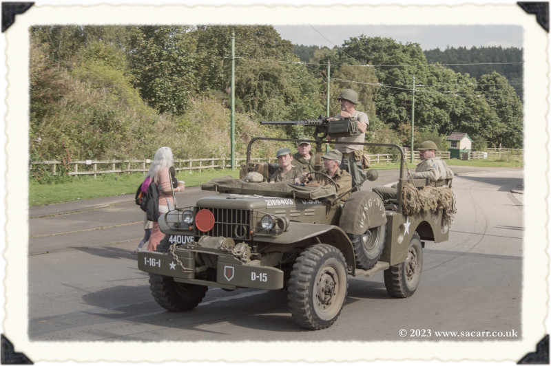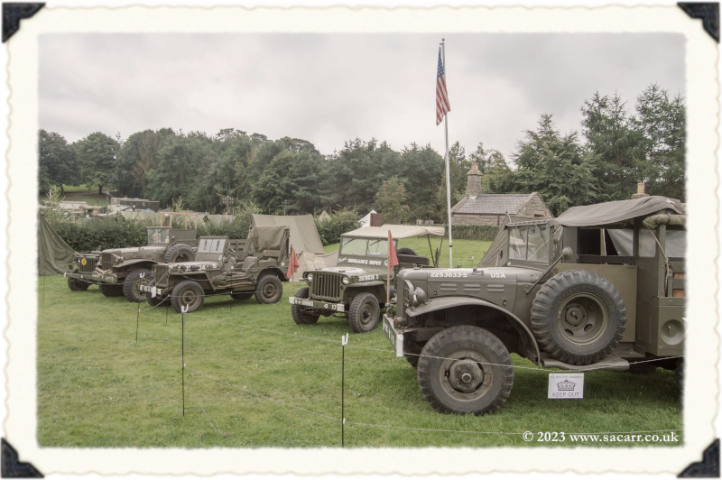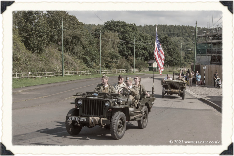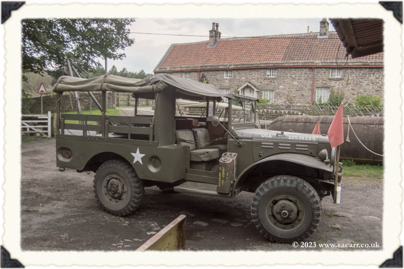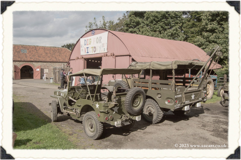 | After we completed the convoy, we drove out of the Beamish staff gate and up the public road to the 1940s farm. Neil and Derek were already there. There is an internal road to the farm, but it is quite steep and only suitable for Jeeps. Using the main road was a safer drive, avoiding all the public walking up the internal farm road. A brass band was playing in the main barn with a small dance floor and seating. |