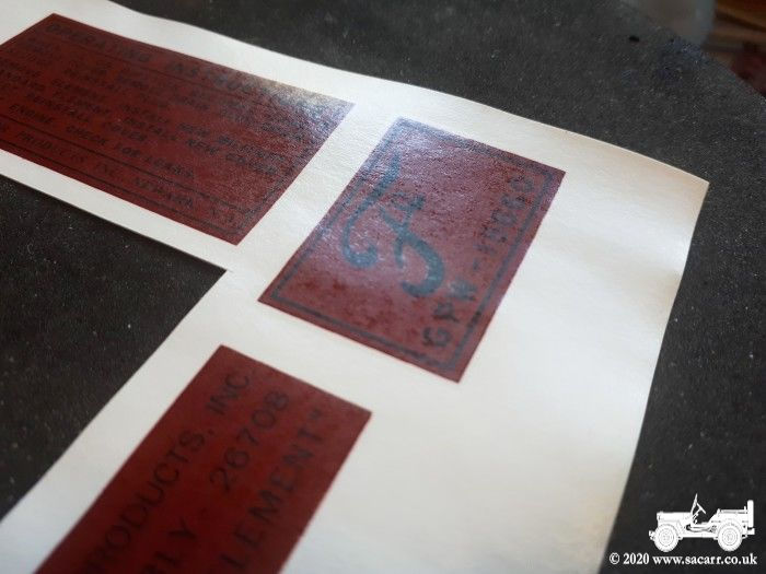 The decal must have stretched a little during my fight to release it and once laid on the filter, had a few small wrinkles around the edges. To fix this, I used a modelling product called Microsol. It is a mild decal solvent which at first wrinkles and softens the decal and then shrinks a little as it dries. Along with a little gentle pressure with a small paint brush, the wrinkles were slowly flattened. Close inspection of the Ford decal sheet showed them to look more matt than the Willys set, as if the ink had soaked through the decal film. While there were no signs of ink on the backing paper for the fuel filter decal, something is stopping it from releasing properly. The paper was also slightly wrinkled as if by damp, even though it arrived in a sealed bag. I have messaged the Ebay seller and sent some photos, so hope to get a replacement set, as I don't want to fight the other three Ford decals for the oil filter. |