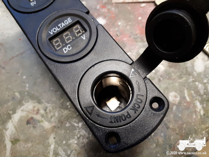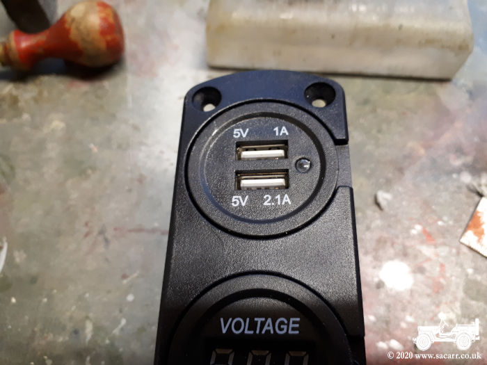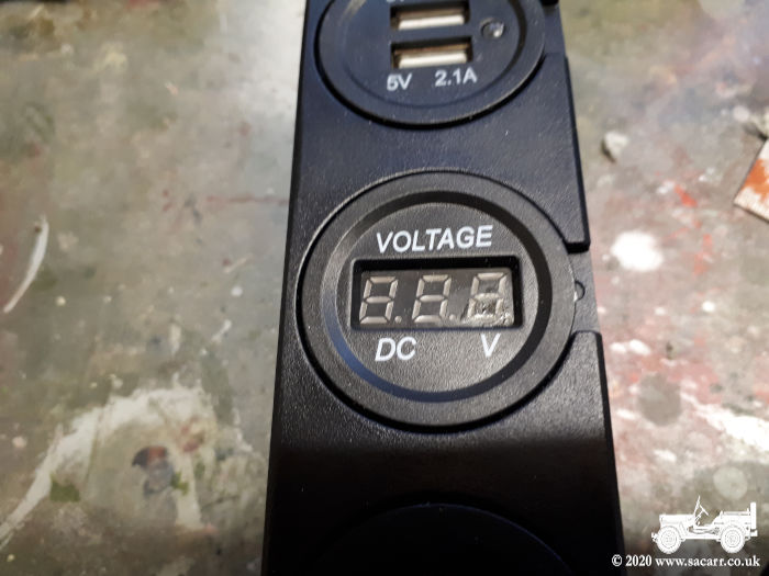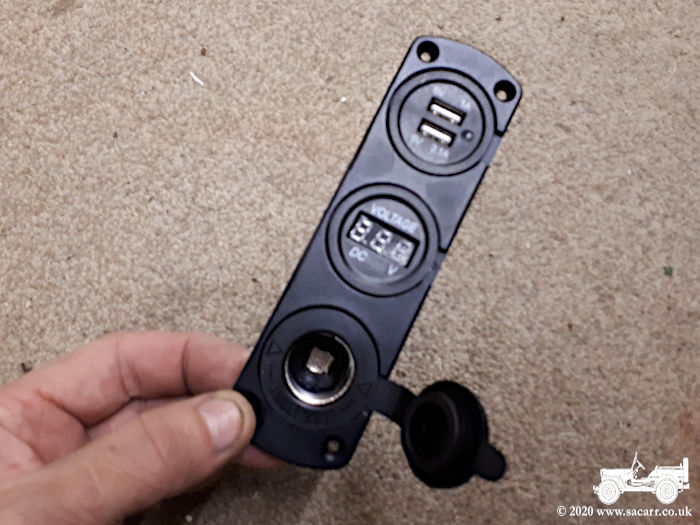 | Power Supply The following pictures are a little gadget I picked up for "Hope" from Ebay. It's a three output power supply and combined volt meter. "Jessie" has already got a 24 volt to 12 volt converter so I can power a sat-nav and charge my phone. "Hope" had nothing, so I got this 12v cigar lighter socket and twin USB output set to mount in the glove box. That will need a mounting box made to both attach the electrics and protect the wiring from other items in the glove box. I'll also want a power cut off switch. |