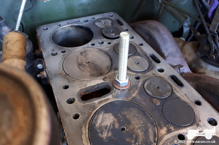 | On the 15th, the gasket was fitted and head bolts torqued up, nipping up the nut on the new stud at the same time. Once back together, I gave it a run, but got some weeping passed the threads in the new stud as it was a bit smaller than the head hole and the washer on top wasn't making a good seal. Like on the rear crank bearing seal, I made a mini rope seal soaked in gasket seal which was pushed down around the stud. A plastic crush washer was next, then a metal washer and nut. That seemed to fix it. It's a bit of a bodge, but I felt this was the least destructive way of sorting the problem and something that is reversible. It's got to be better than not being bolted down at all. |