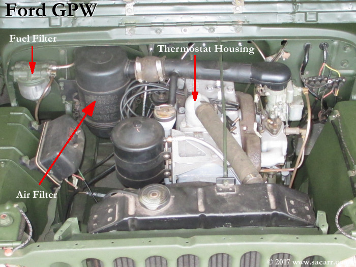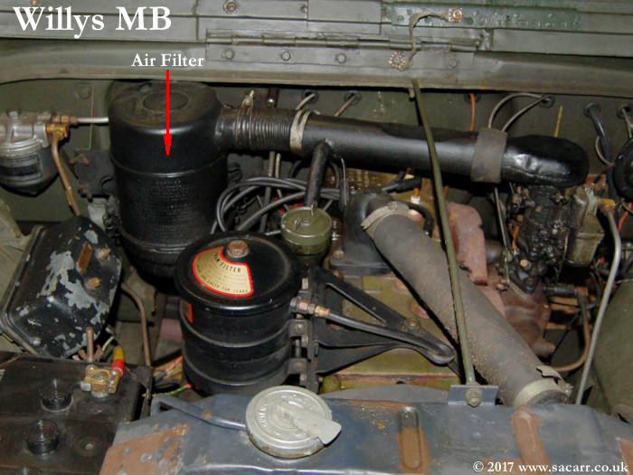 As a result of the second battery, the M201's air filter was moved to the left side of the vehicle. On the MB and GPW, it was mounted on the right side of the firewall, next to the fuel filter. |