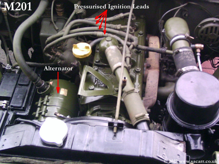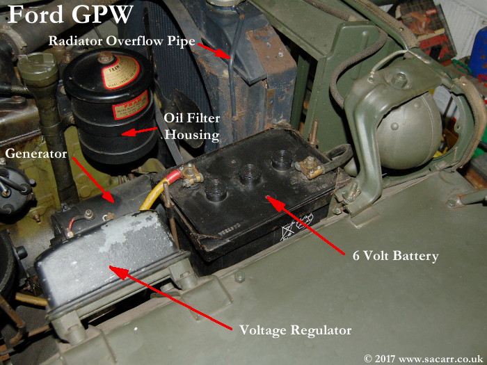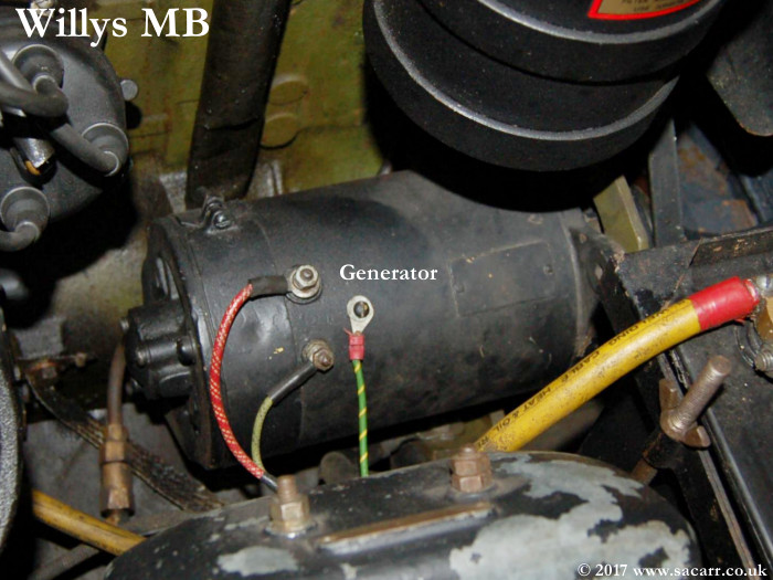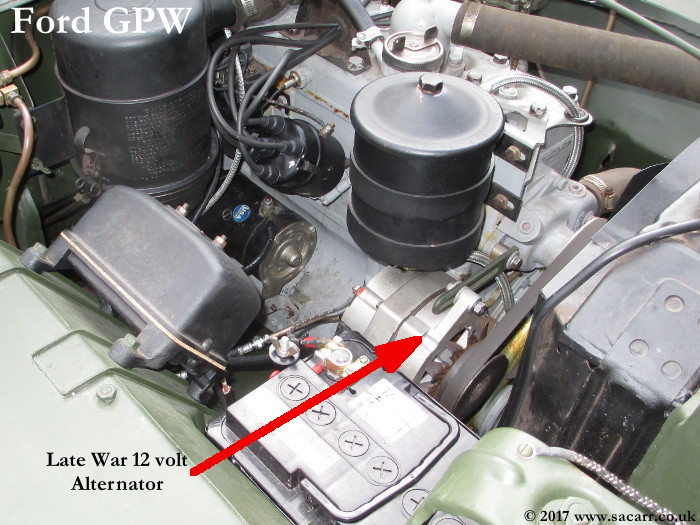 The M201 had a large powerful alternator fitted. The MB and GPW had a much smaller dynamo, but late in the war, there was a 12 volt alternator conversion fitted, as seen on the GPW. |