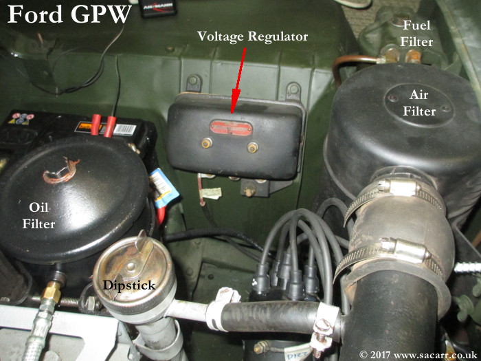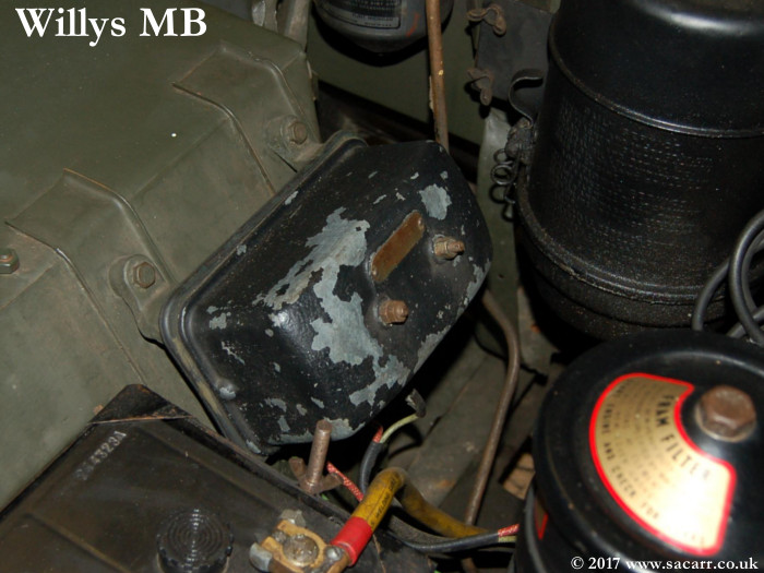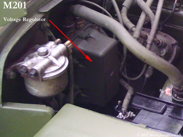 With the fitting of a second battery to the M201, voltage regulator was moved from behind the battery to the firewall, next to the fuel filter. It is also a different style case to the MB and GPW version. On the MB and GPW, the regulator was fastened to the right fender. |