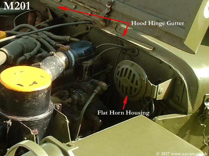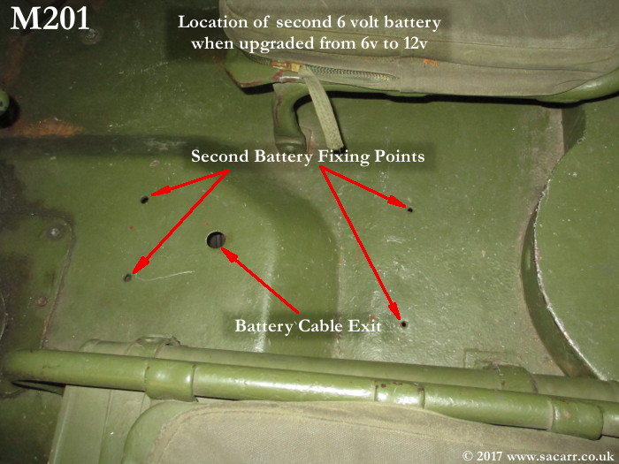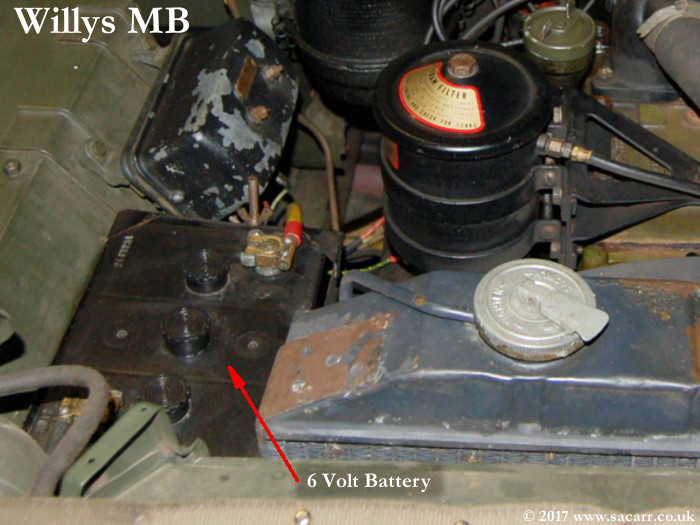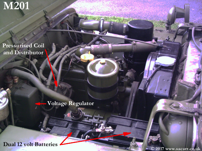 The MB and GPW started life on 6 volts, although late in the war, I believe there were some 12 volt Jeeps. The early M201's were also 6 volt, but evolved to 12 volts. From 1960 onwards, M201's were upgraded to 24 volts, the NATO standard. This was achieved by fitting a second battery behind the first, displacing the voltage regulator from the fender to the firewall. This then forced the air filter to be moved to the left side of the engine bay. |