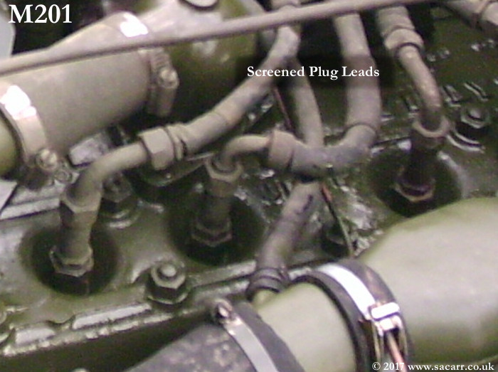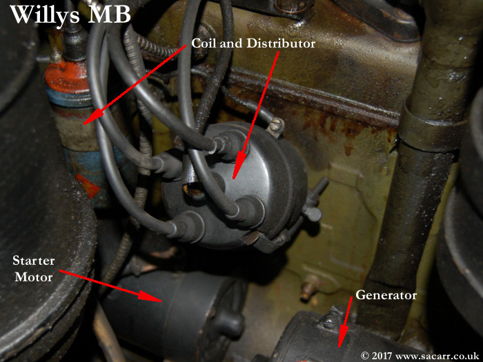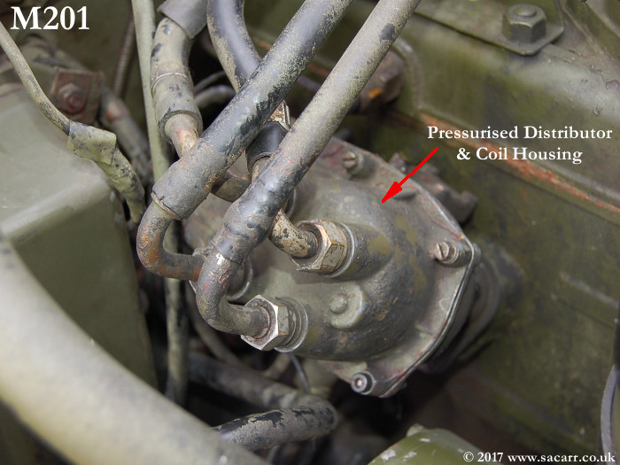 The distributor, coil and ignition leads on the M201 was completely sealed and watertight, using positive pressure from the air filter intake. The MB and GPW had a standard distributor and points, with a separate coil mounted on the block behind the distributor. |