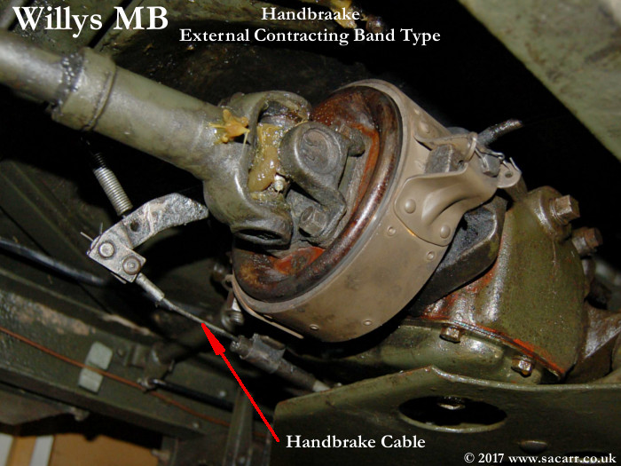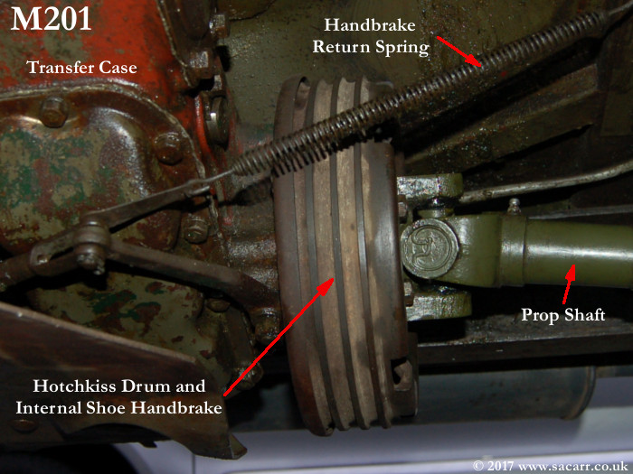 The handbrake on the M201 operated like a normal drum brake with the brake shoes on the inside of the drum. Willys and Ford Jeeps had an external contracting band brake, 'though late war Jeeps had internal shoes like the M201. |