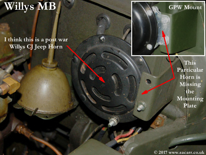 The Willys and Ford vehicles had various horn styles. An early design featured a long trumpet on the front. This was replaced with a flat round design. The M201 horn was similar to the flat type, but with a different slot pattern and converted to 24 volts where necessary. |