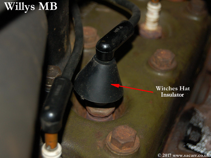 The M201 plugs were also sealed and shielded to work with the watertight distributor. The MB and GPW Jeeps used standard rubber insulated push on leads. These should be fitted with a 'witches hat' insulator, but they are often removed as they can lead to shorting. |