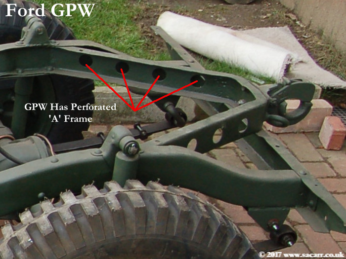 The M201 'A' frame is a 'U' channel with a broad vertical face and narrow edges to the 'U'. Where the legs of the 'A' meet the chassis, there is a cross member. The MB 'A' frame is also a 'U' channel, and like the M201 frame, there is a cross member. The Ford GPW frame is perforated with four holes along each side to reduce steel useage during wartime. There is no cross member on the GPW. |