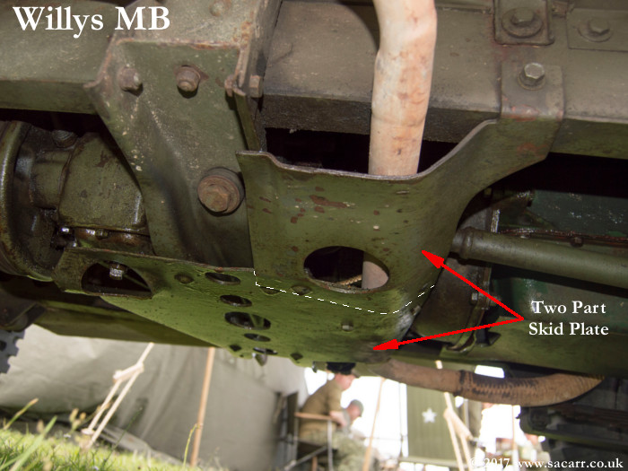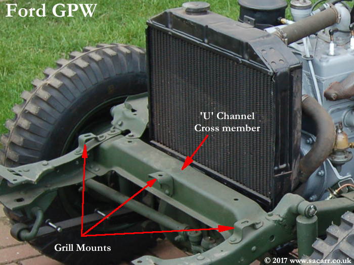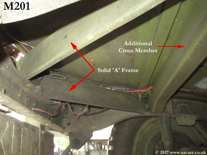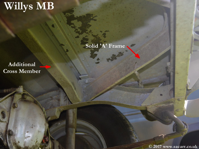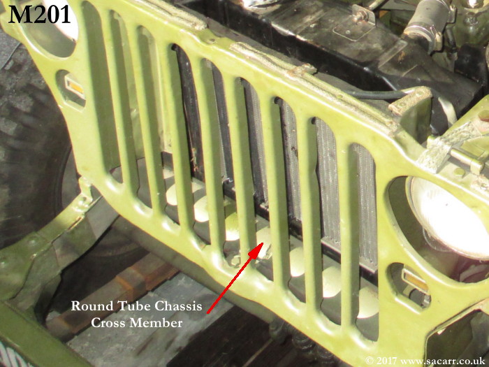 Both the M201 and Willys MB have a circular section tube for the front cross member of the chassis. The Ford GPW has an inverted 'U' channel for the cross member. |