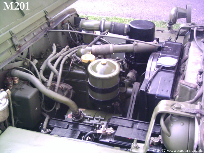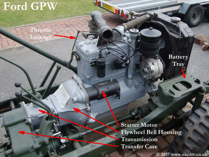 The M201 and Willys MB engines and transmission were the same green as the vehicle, whether that was NATO green or wartime olive drab. The Ford engine block, bell housing and transmission were Ford Grey, but the transfer case was olive drab. |