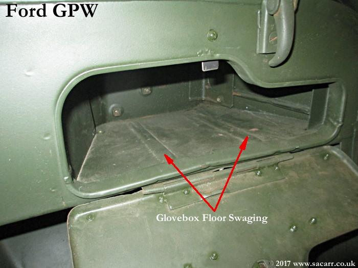The floor of the glove box on my M201 has two swaged stiffening strips on the glove box floor. As yet, I don't know if this was common to all M201's or whether mine has had a recycled Ford GPW glovebox. The Willys MB glovebox has a flat floor. On the Ford GPW, there are two swaged stiffening strips on the floor. |