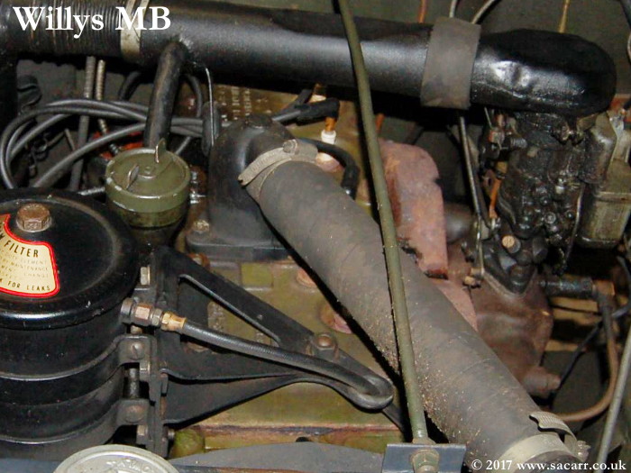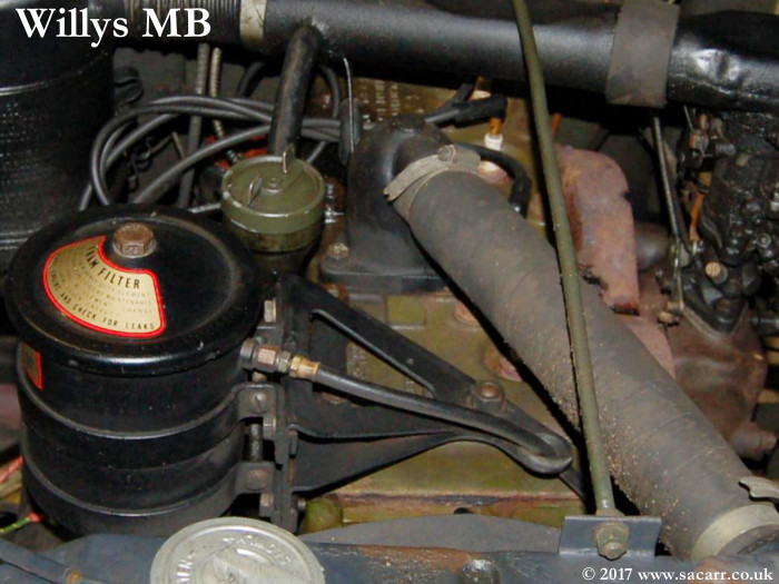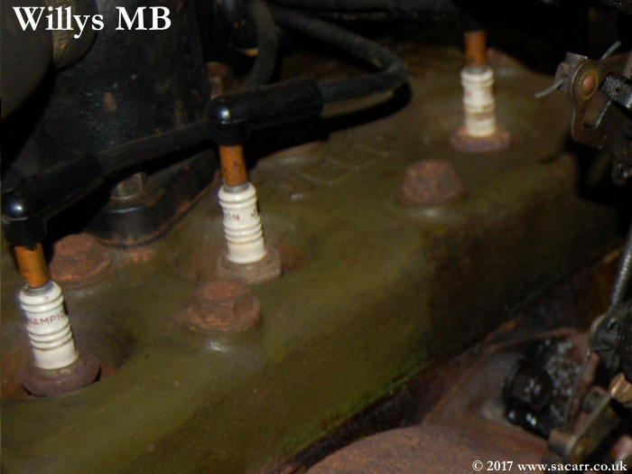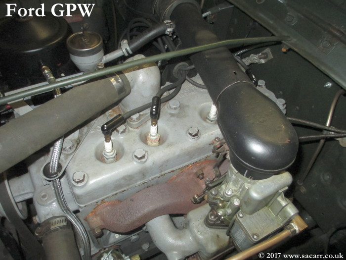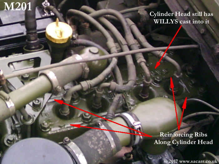 The Jeep cylinder heads were similar in overall design. The M201 head has WOF cast into the head under the oil filter bracket. This stood for Willys Overland France. The M201 head also had additional reinforcing ribs between the head bolts ( arrowed in the second M201 engine picture ). The Willys head has Jeep cast into it near plugs three and four. It doesn't have any reinforcing like the later M201 head. The Ford head has the script 'f' cast into it at the front under the oil filter bracket. Some Go-Devil cylinder heads were bolted down while others had studs and nuts. |