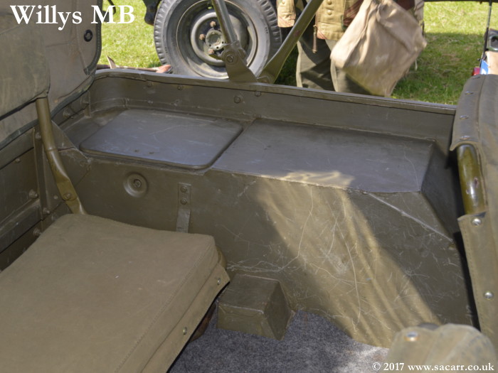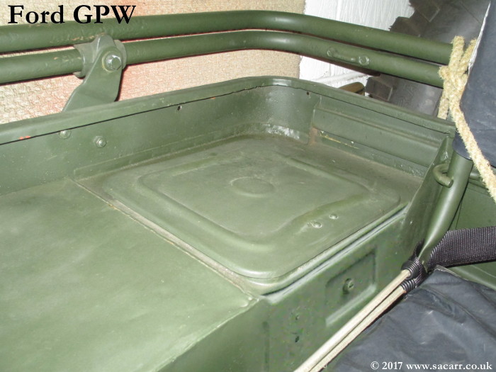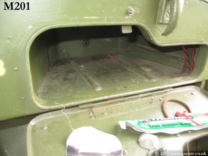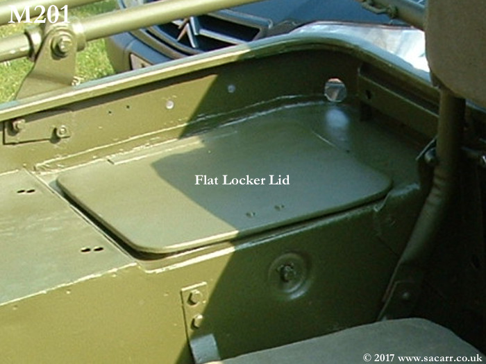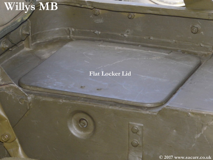 Locker lids on the M201 and Willys MB were plain and flat. The Ford GPW had a stiffening ridge all around the lid, embossed outwards and a circular embossed centre. On the Willys and M201, the lid hinge was held in place with nuts and bolts. The Ford hinge was bolted, but the nuts were brazed onto a strip of metal, rather than being individual nuts. |