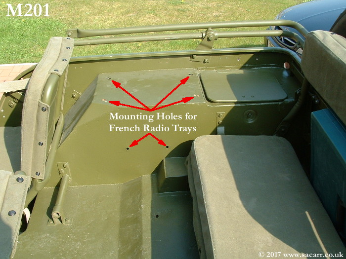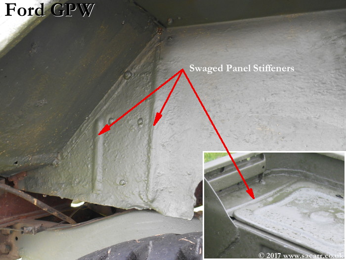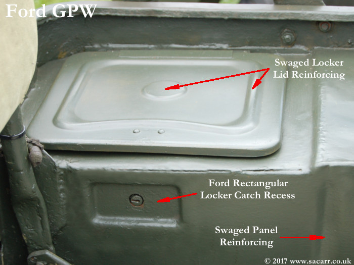 The M201 wheel arch has flat sides and is sometimes seen with multiple holes in the top which were the mounting points for radio trays. The Willys MB wheel arch is similar. The Ford GPW wheel arch has two vertical swaged stiffening ribs in the side. It also has another on the top behind the locker lid. |