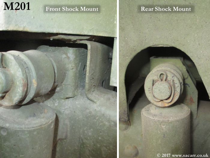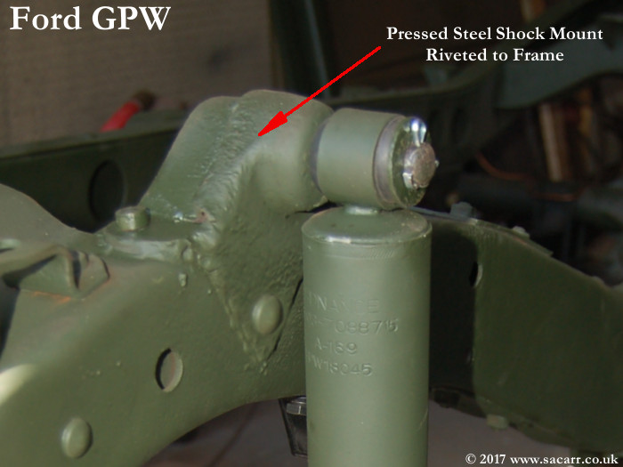 The chassis mounts for the M201 shock absorbers are made from a section of steel 'U' channel, slightly wider than the chassis, allowing two legs of the 'U' to pass down the sides of the chassis to be welded. The round section bar that the shock fits on to passes through the top of the channel. The Willys MB shock mounts are formed the same way as the M201. The Ford GPW has a two piece pressed steel mount riveted to the chassis, 'though mine has signs of welding along the edges of the steel. The mounts have the Ford script 'f' stamped into the outer flange. |