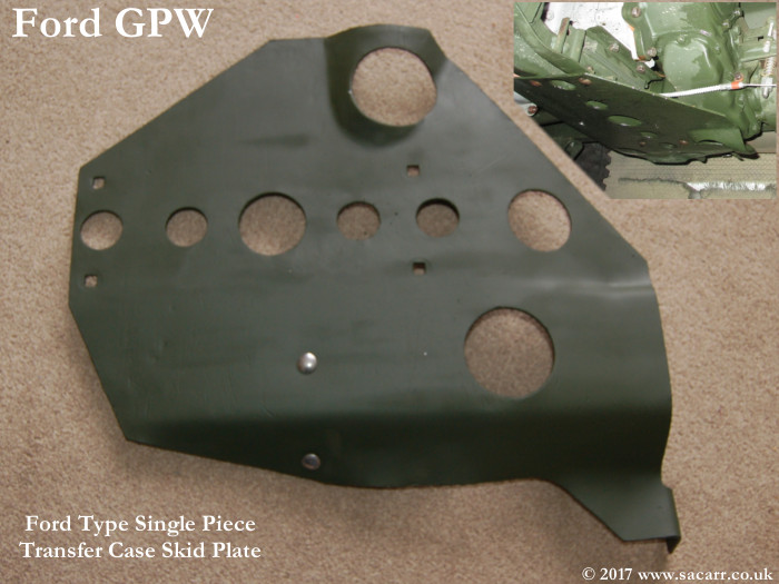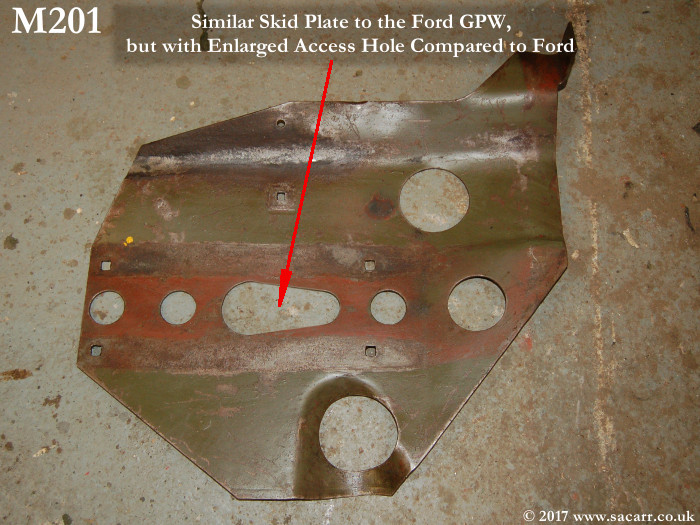 The M201 skid plate was a one piece unit, with five holes along the centre, one of which is enlarged covering the area of the two holes in the centre of the Ford plate. The Willys plate was a two piece unit, the white dotted line shows the two parts. This is the most common seen, but there were a number of different skid plates on the Willys MB's, depending on the date of production and the type of handbrake used. The Ford plate is a one piece unit like the M201, but with a row of six holes along the centre. |
