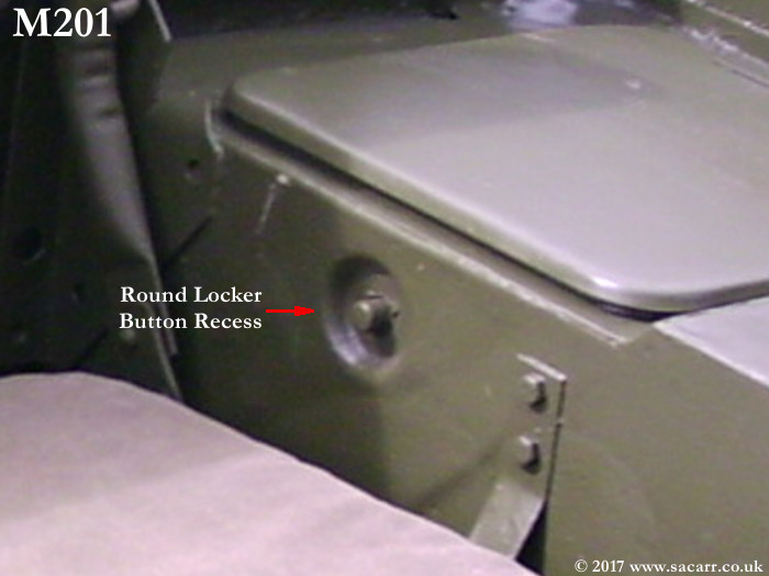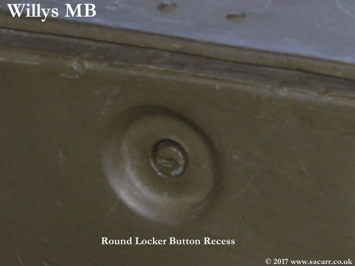 The locker catch recess on the M201 and Willys MB were round. On the Ford GPW, it was a rectangle. However, on Ford Jeeps with the ACM type body, they could also have the round recess. The button on the M201 was plain, where as wartime Jeeps had a key lock. |