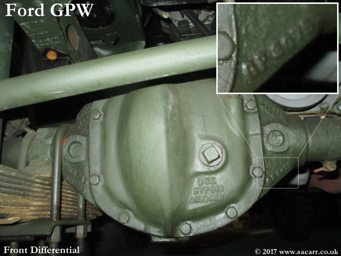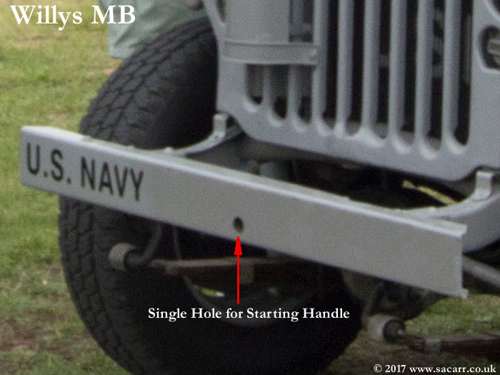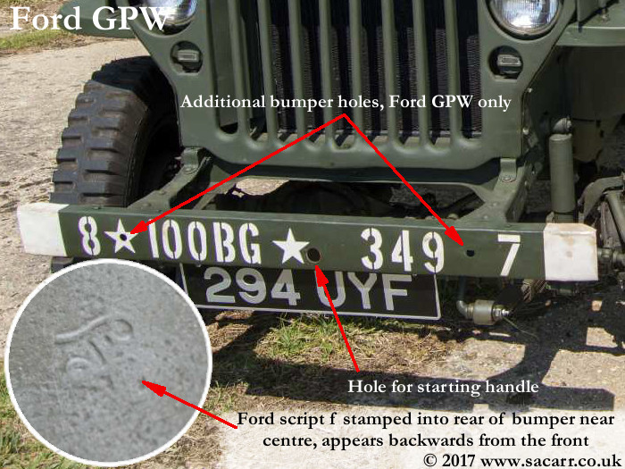 The M201 front bumper is slightly taller than the MB and GPW bumper. Both the M201 and Willys MB bumper have a single hole for the starting handle. The Ford GPW has two additional smaller holes in line with the chassis leg. It also has a script 'f' stamped in from the rear. |