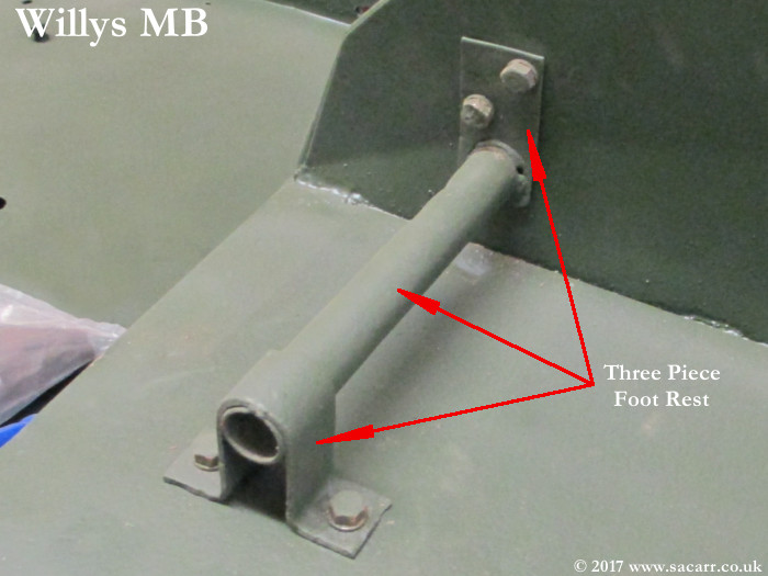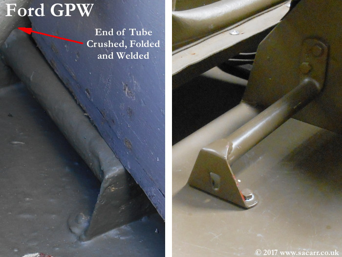 The M201 and MB footrests are made from three pieces, a tube and two brackets. The Ford GPW footrest was made from two parts; one bracket and the tube, which is crimped and folded at one end for form the other mounting bracket. The bracket can be seen below in two forms, one solid and the other with a hole below where the tube is welded in place. |