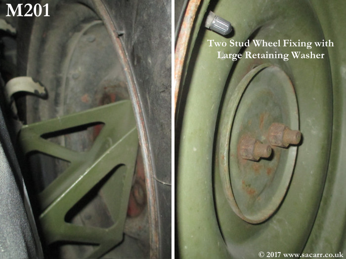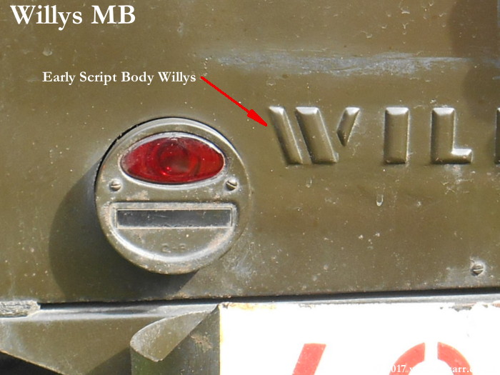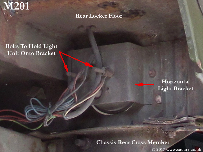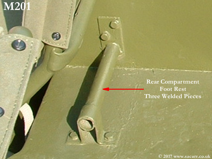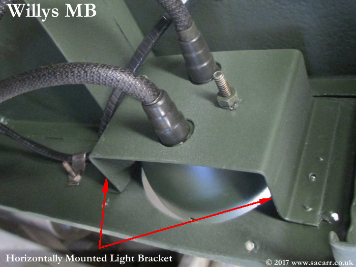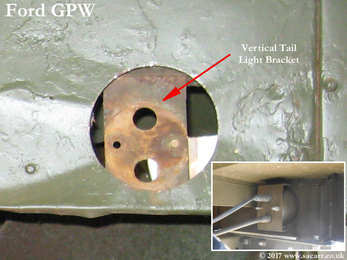 Both the M201 and Willys MB have a top hat shaped bracket, fitted horizontally across the back of the tub, for mounting the rear light cluster. On the Ford GPW, the bracket is mounted vertically. However on Ford built Jeeps with ACM type bodies, the rear body style is the Willys type and feature the horizontal light brackets. |