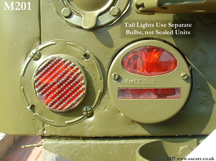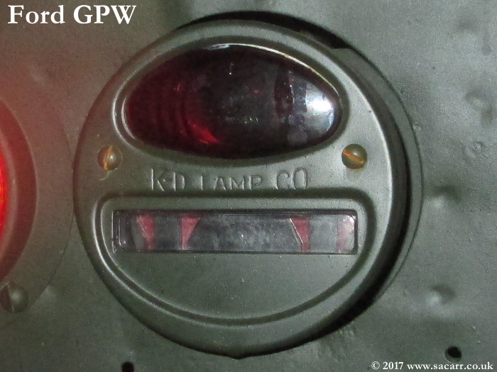 M201 lights look similar to wartime lights, but have a more angular steel pressing. This example has 28v embossed in the case, and cheese head screws. There were separate bulbs with a colour glass lens in the case. The MB and GPW lights are similar, though this one has had the convoy light replaced with a yellow indicator lens. The GPW light has baffles partially covering the marker light, while the brake and tail lights are in the top. These lights were sealed beam units, where the whole lens was the bulb. The case is held on with mushroom head screws. |