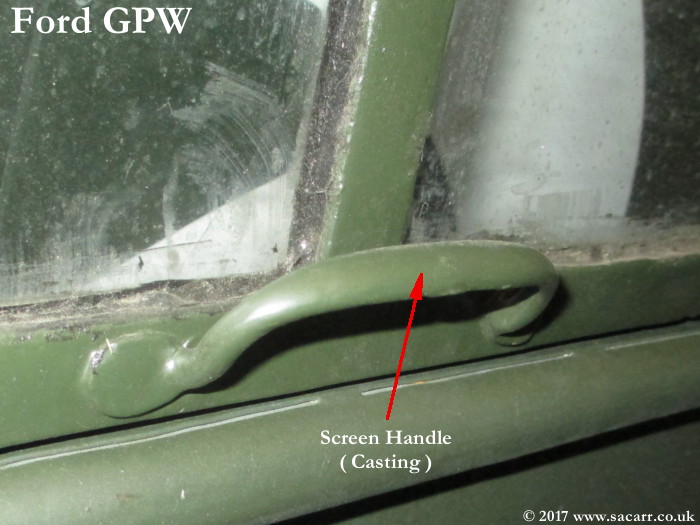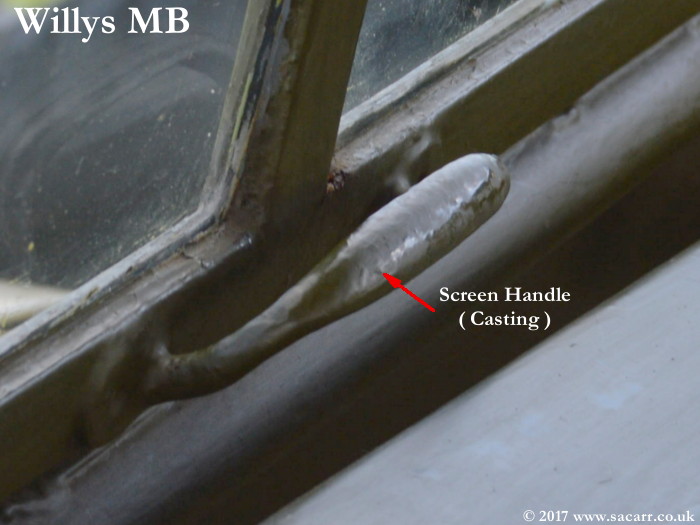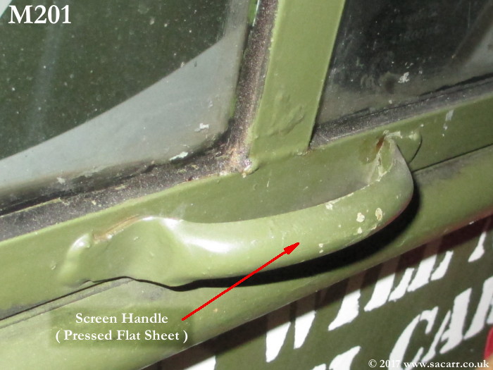 The Hotchkiss M201 handle is made from a sheet of flat steel, stamped into the handle form. On the Willys and Ford built Jeeps, the handle was a casting. |