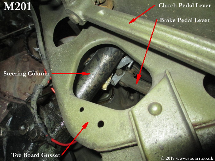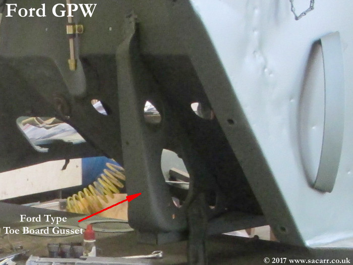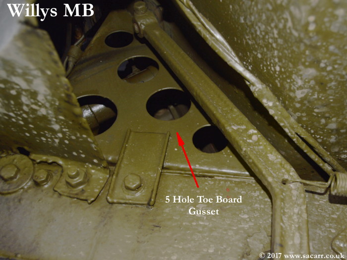 The Hotchkiss M201 and Ford GPW toe board gussets are quite similar, with a triangle shaped fillet, with rounded corners and three holes, 'though the holes differ in shape. The Willys MB gusset is flat sided with angular corners and five holes. Later Willys MB's that used the composite American Central Manufacturing Co ( ACM ) bodies, and can be seen with the Ford style gussets. |