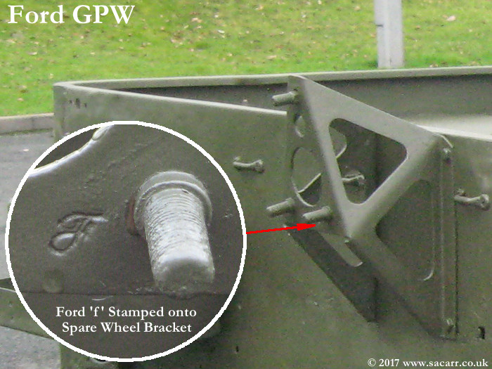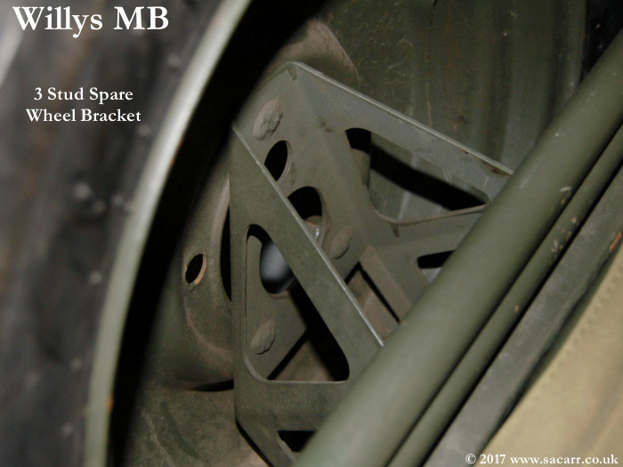 The spare wheel brackets were similar on all vehicles, although the Ford type was stamped with the script 'f' Some were three stud brackets such as those shown on the MB and GPW, using the wheel stud holes to mount the wheel with three right handed wheel nuts. There was also a two stud type which had a large steel washer over the centre of the hub, and two wheel nuts to hold it in place. |